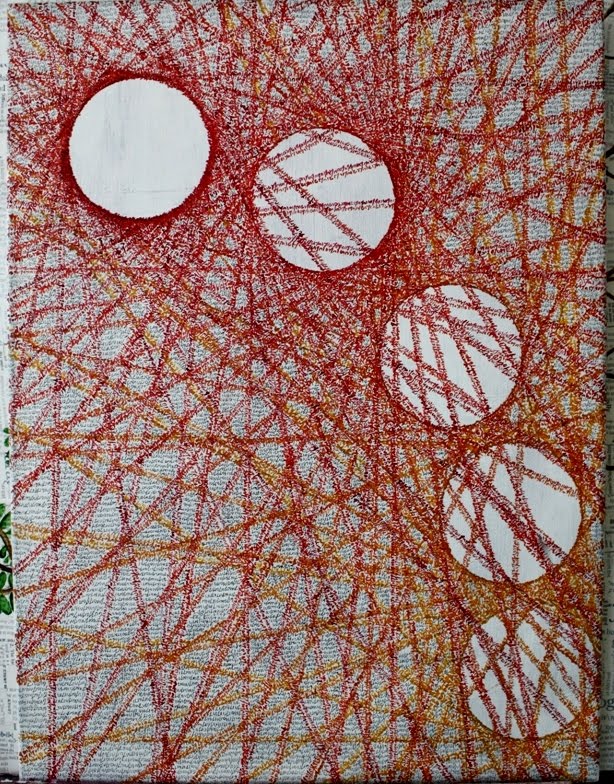 This painting is a huge departure from what I normally do. There is no collage. Just writing, and it isn’t in some sort of a grid, but centers around a circle. I used warm colors against a stark background.